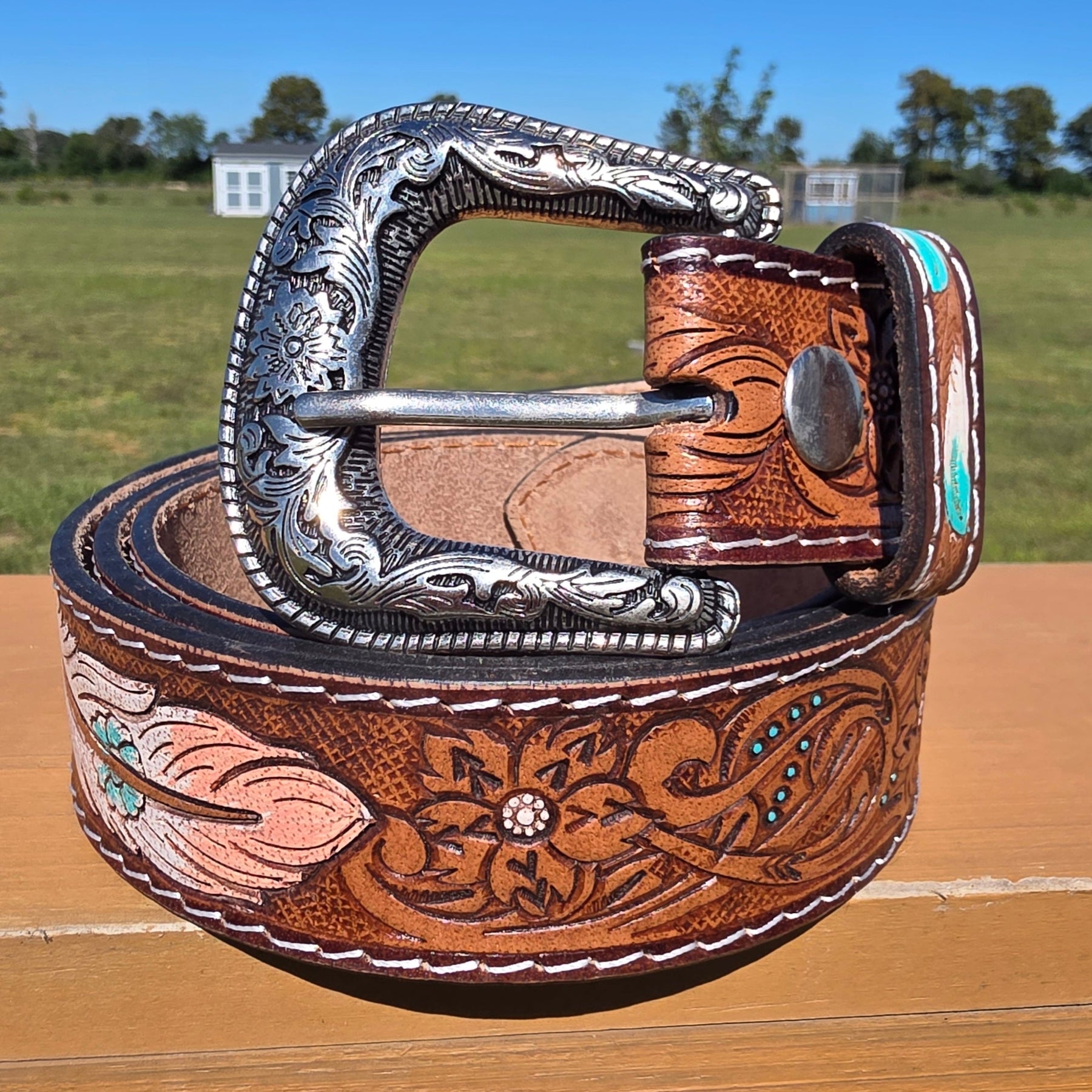 The BB Wandering Feather Belt is a true work of Western art — handcrafted from genuine leather and intricately tooled by skilled artisans. Featuring detailed feather and floral carvings with turquoise-painted highlights, this belt blends rugged beauty with refined craftsmanship. The engraved silver buckle adds a classic Western touch, making it a statement piece that’s both bold and timeless.