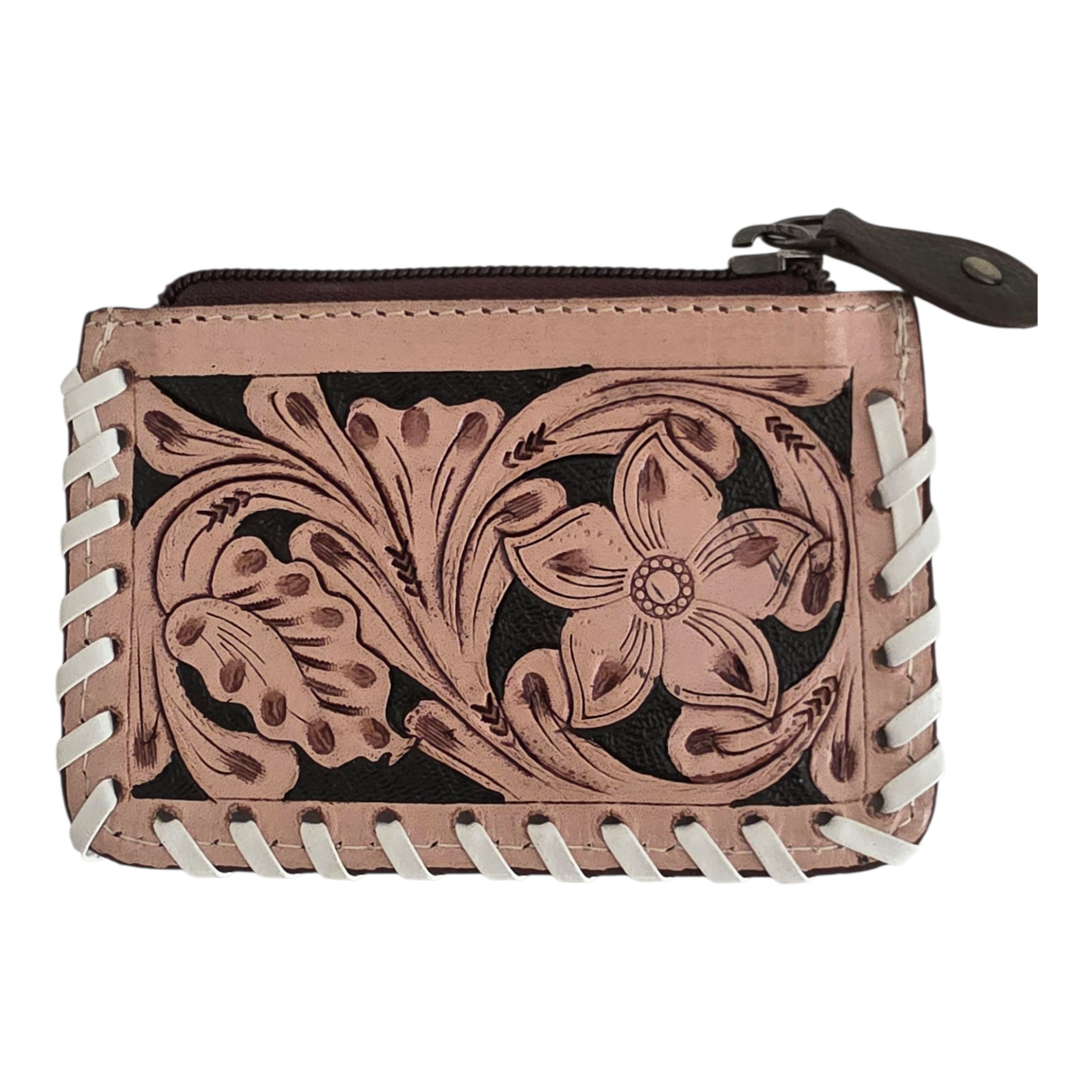 Finished with braided leather edging and a secure zipper closure, this little wallet adds western charm to any bag. Carry it on its own or clip it inside your favorite BuckleBird tote, crossbody, or concert bag.