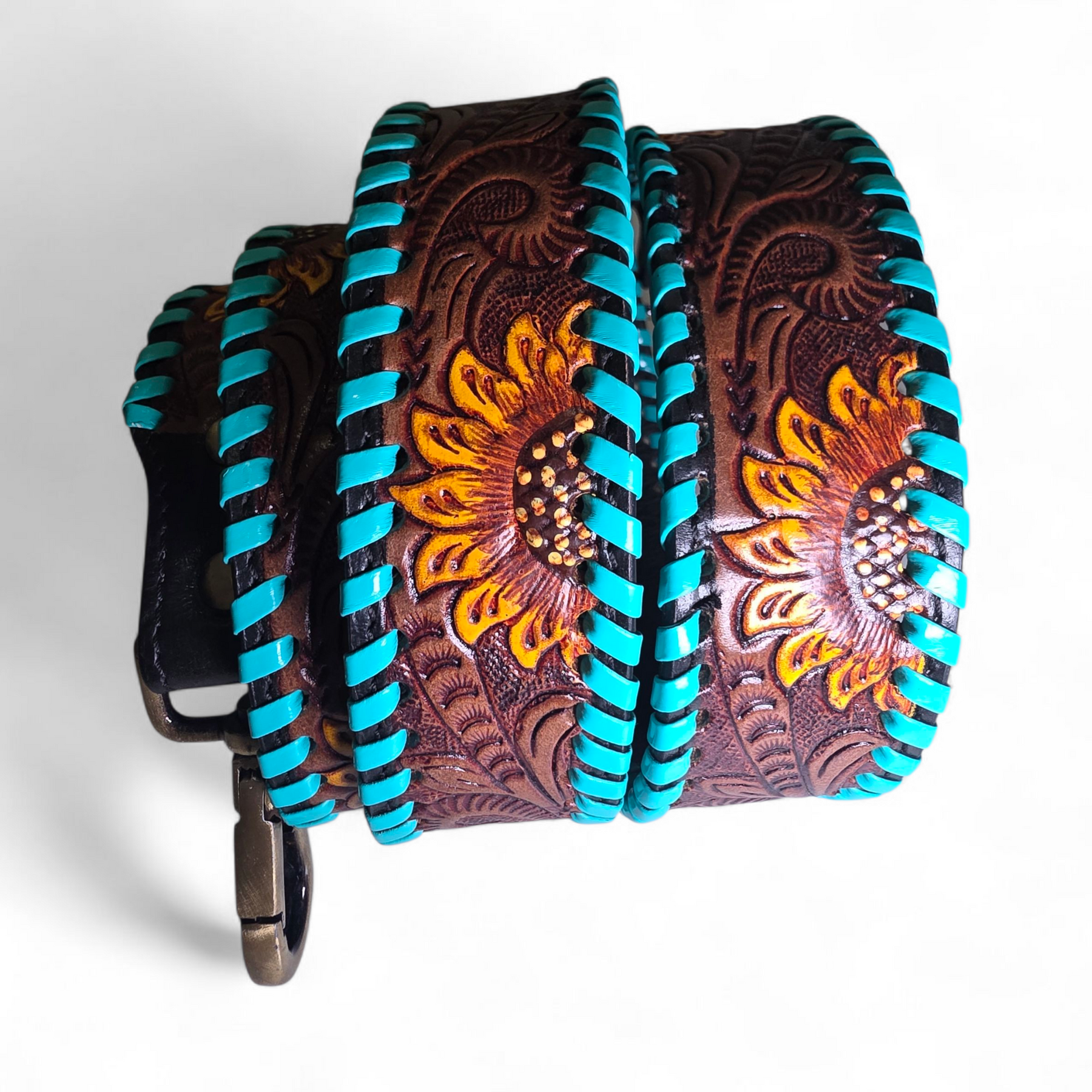 Bring sunshine and western flair to any bag with this handcrafted tooled leather strap. Featuring detailed sunflower tooling, warm hand-painted tones, and bold turquoise edge lacing, the Solara Strap is designed to stand out while offering everyday durability. Finished with heavy-duty antique brass hooks, it clips easily onto most bags — giving you a stylish swap that transforms your tote, crossbody, or Guitar instantly.