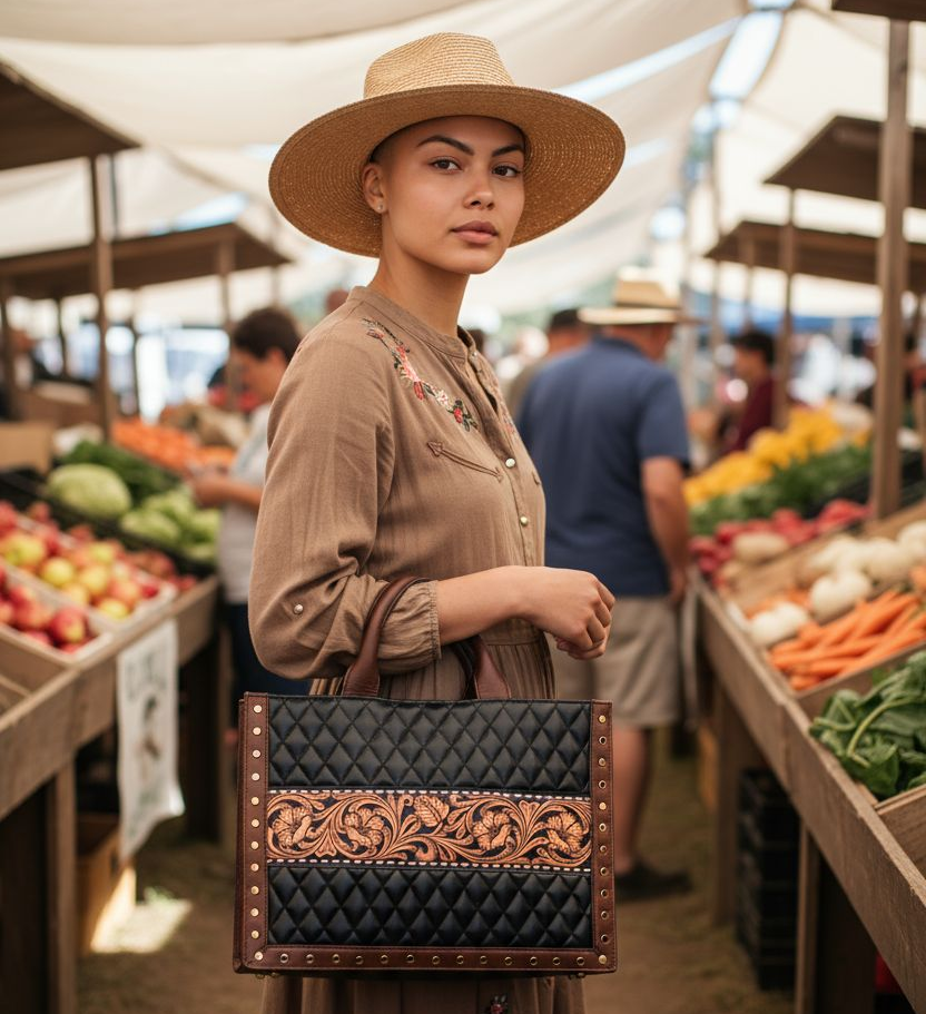 The Diamond Lattice Tote | Tooled & Quilted Leather Western Handbag
